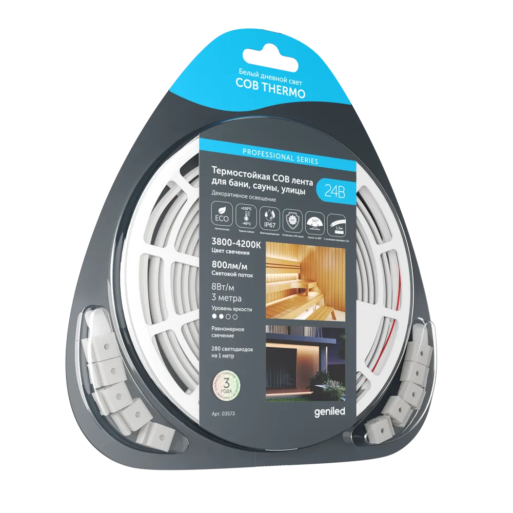 Светодиодная термостойкая лента Geniled для бани, сауны и уличного применения GL-280SMD3535 COB 24В 8Вт/м 10х3000 3800-4200K IP65