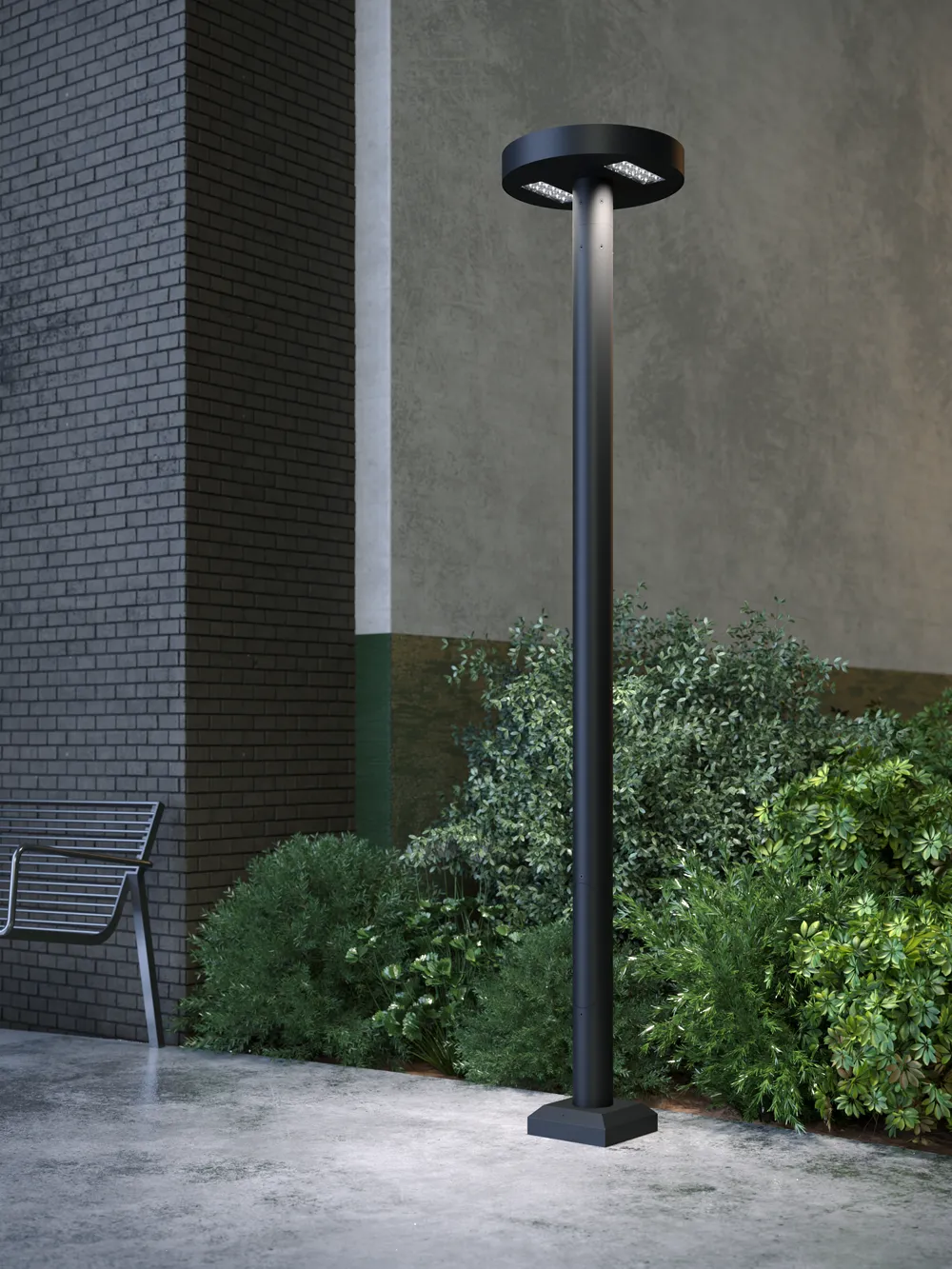 Sirius А модификация, где опора расположена по центру светильника. Корпус в форме диска смотрится аккуратно и вписывается в любой ландшафтный проект, добавляя элегантности и современности общественным пространствам. В светильник устанавливаются линзы из прочного РММА (Ш154х83°, Ш150°). Подходит для освещения дорог, тротуаров. Поможет сделать нужные акценты. Опоры и закладные в комплект не входят.